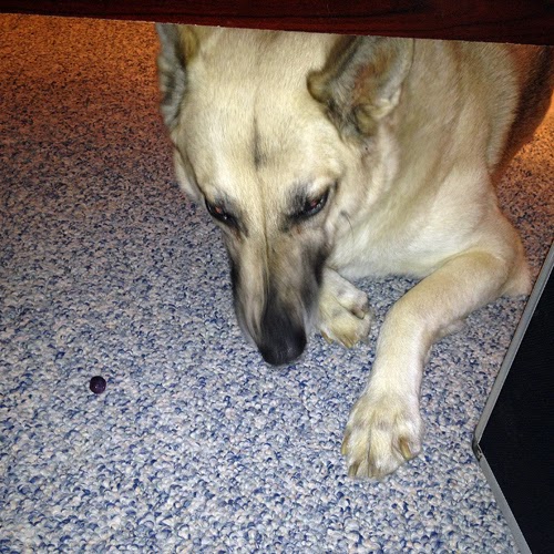 While enjoying a bowl of shredded wheat and blueberries at my desk recently, I dropped a blueberry. Lady, in close proximity to the wayward blueberry, realized right away that she had dibs because Katie was asleep and unaware. This was an exciting moment.